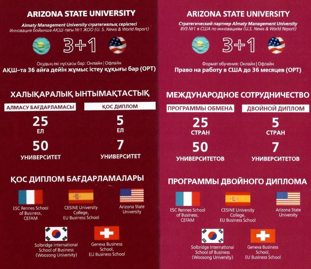 4. Қос диплом: Үздік студенттер 3 жыл оқығаннан кейін Алматы Менеджмент Университеті дипломын алады. Төртінші оқу жылында 1 оқу жылына шығу және Аризона мемлекеттік университетінде дипломды қорғау және АҚШ-та 36 айға дейін жұмыс істеу құқығы бар.