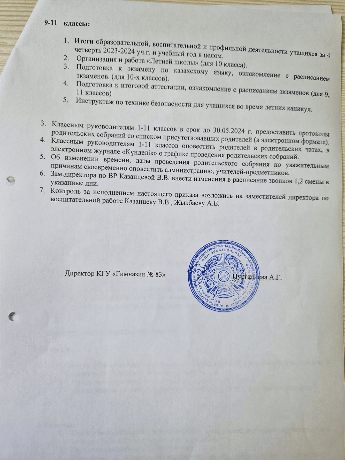 "№83 гимназия" КММ директорының кіріс жіне шығыс жөнінде ата-аналармен жиналысы