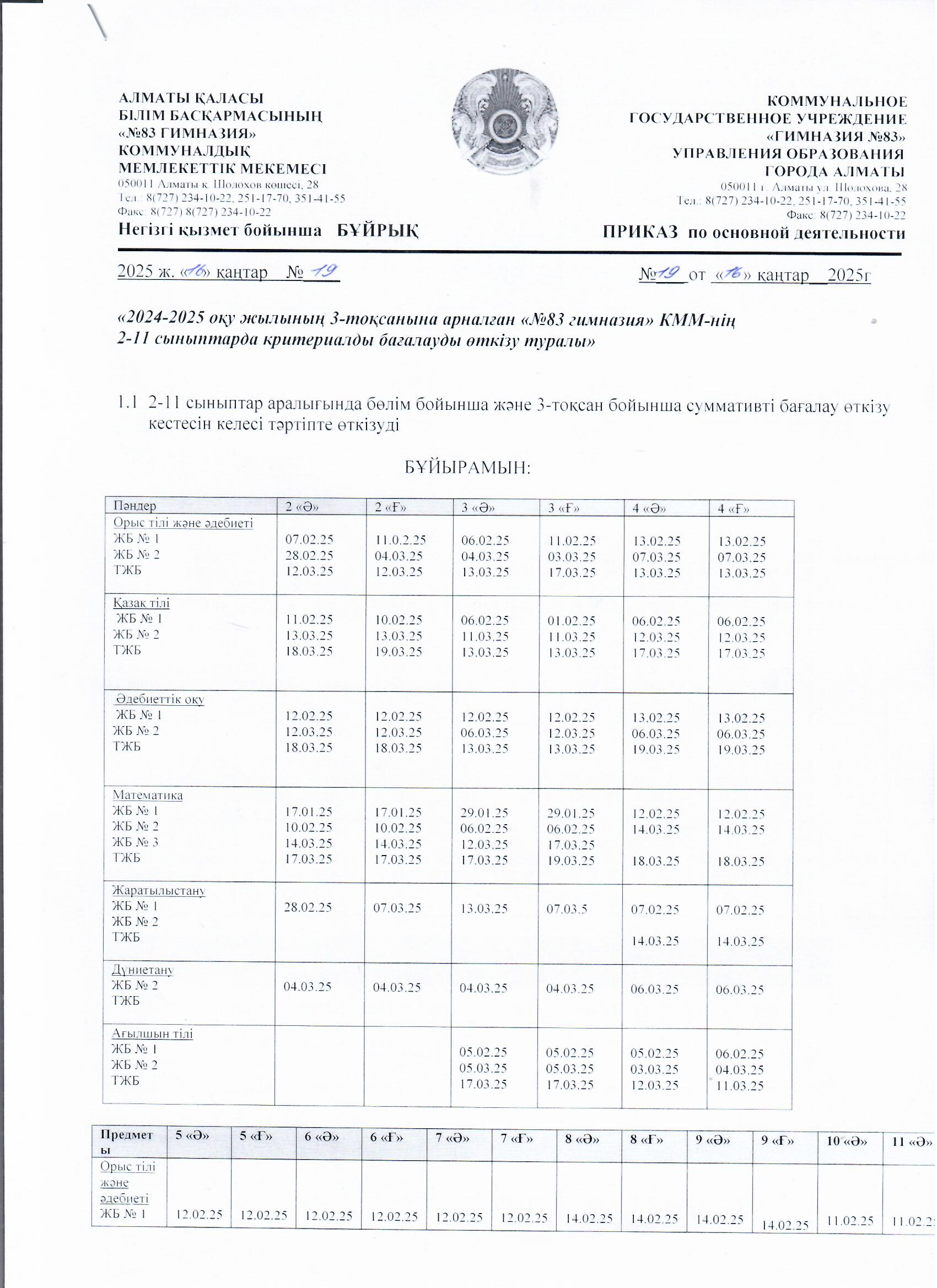 2024-2025 оқу жылының 3-тоқсанына арналған №83 гимназия КММ-нің 2-11 сыныптар арасындағы қорытынды бағалау кестесі