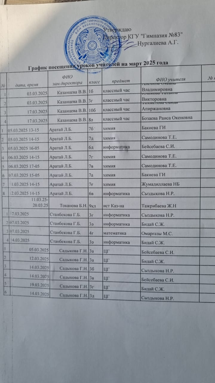 » 2025 жылдың наурыз айына арналған мұғалімдердің сабаққа қатысу кестесі