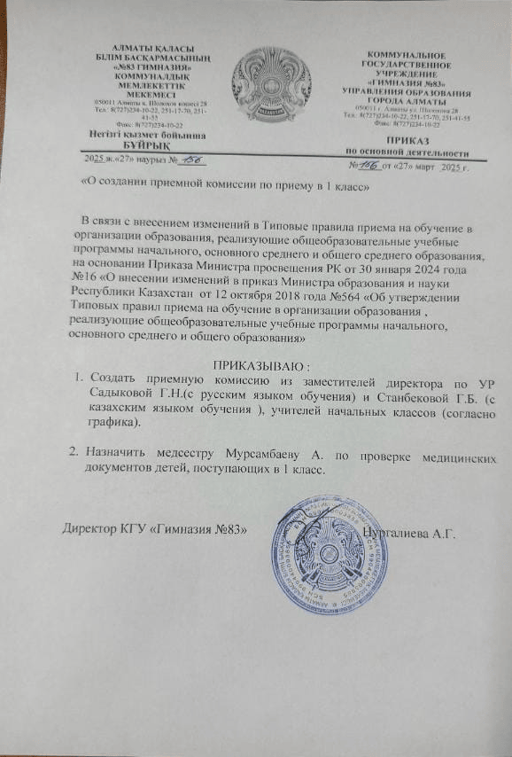 Хабарландыру "№ 83 Гимназия " КММ 2025 жылғы 1 сәуірден 29 тамызға дейін 1 сыныпқа қабылдауды жариялайды