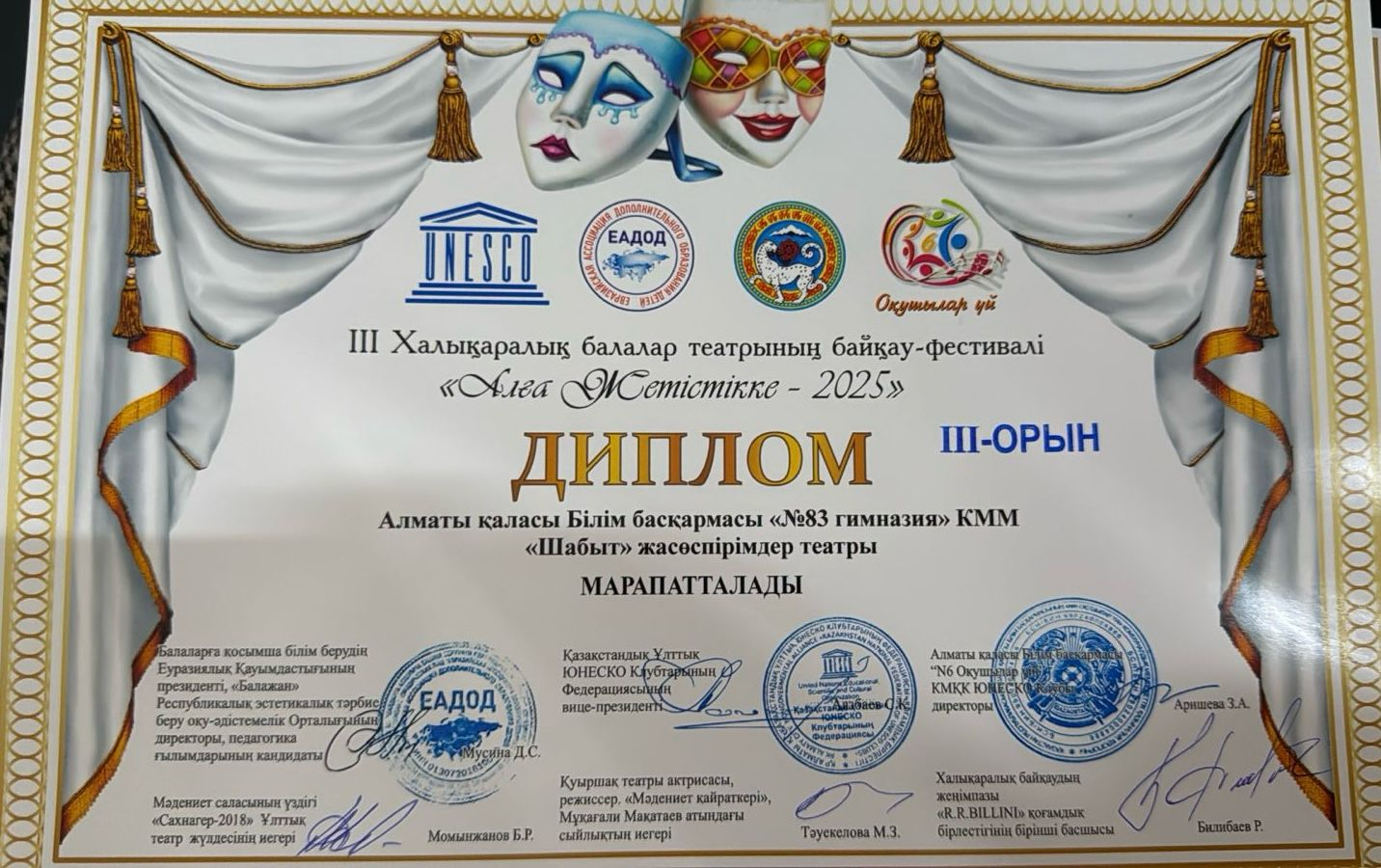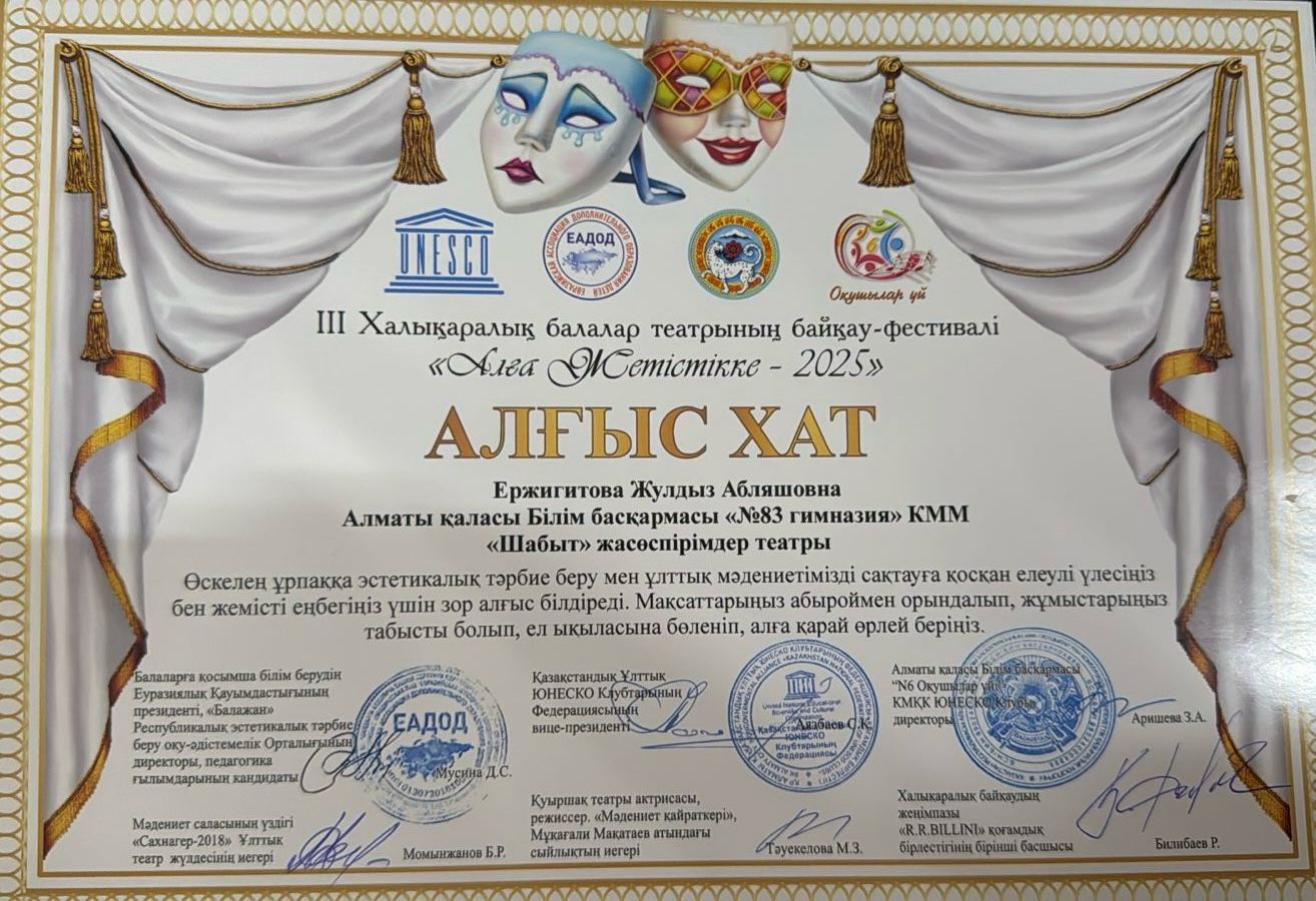 білім беру мекемесінің КМКК «Nº6 Оқушылар үйі» ЮНЕСКО клубының ұйымдастырылуымен III Халықаралық «Алға жетістікке» балалар театр фестиваль -байқауына #83 Гимназия атынан “Шабыт” жасөспірімдер театры қатысып, жүлделі 3 орын иеленді. Қойылымның атауы: “Наурыз мерекесі “