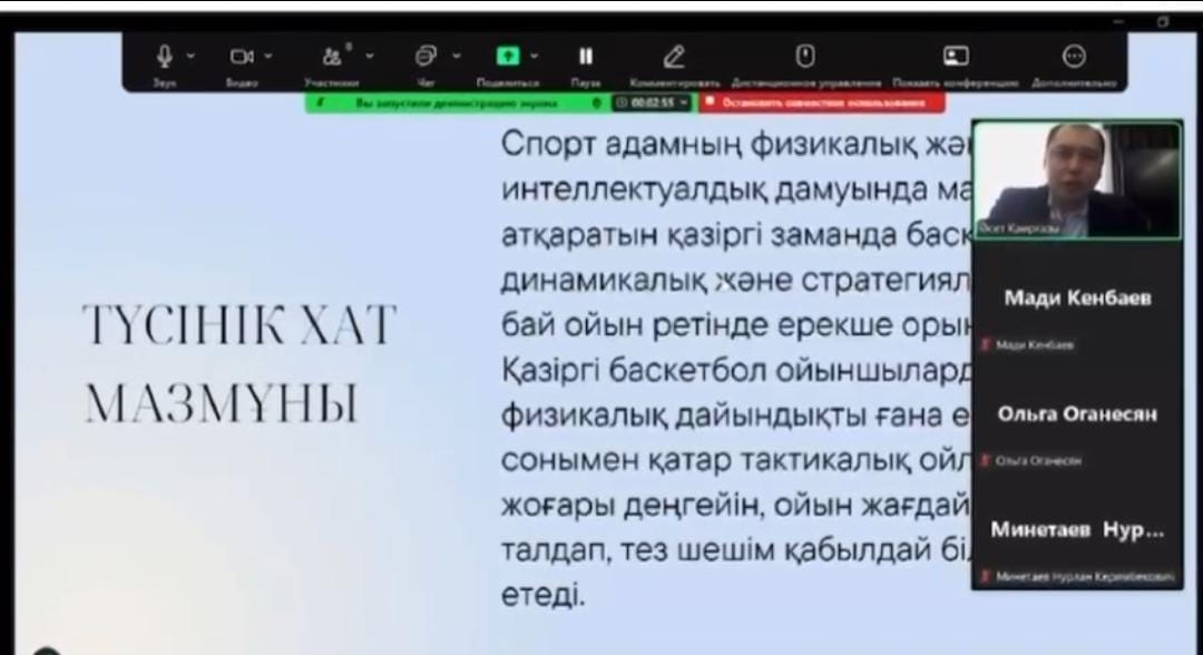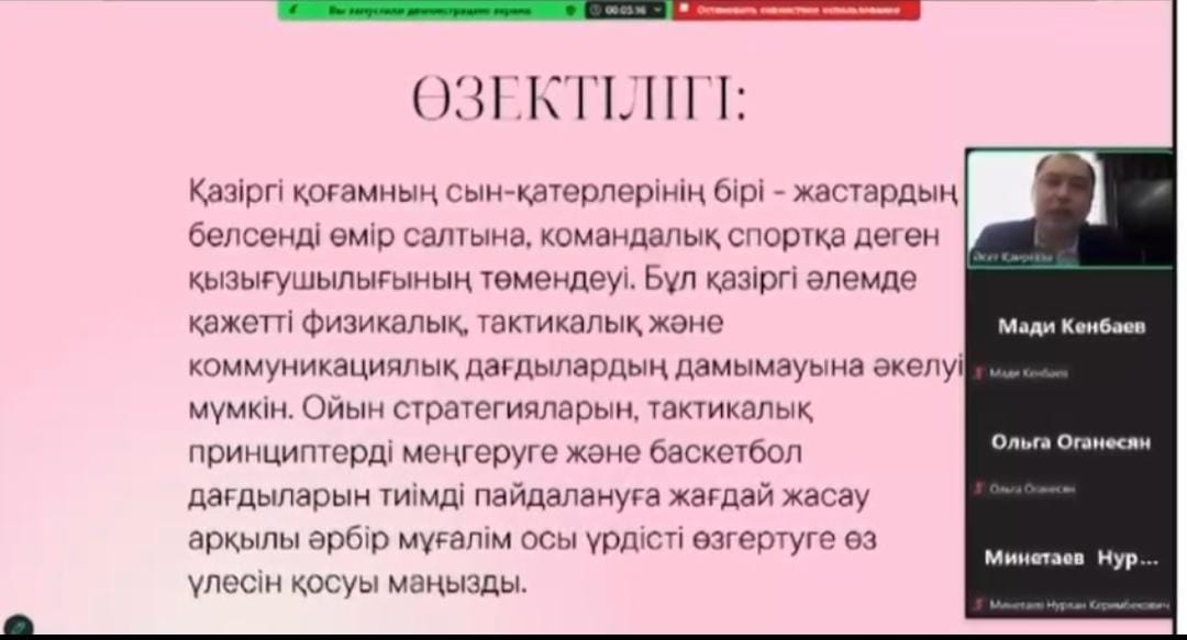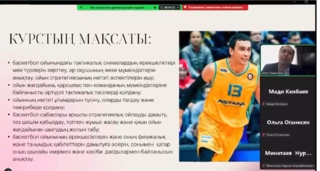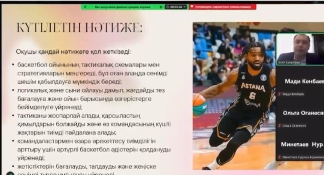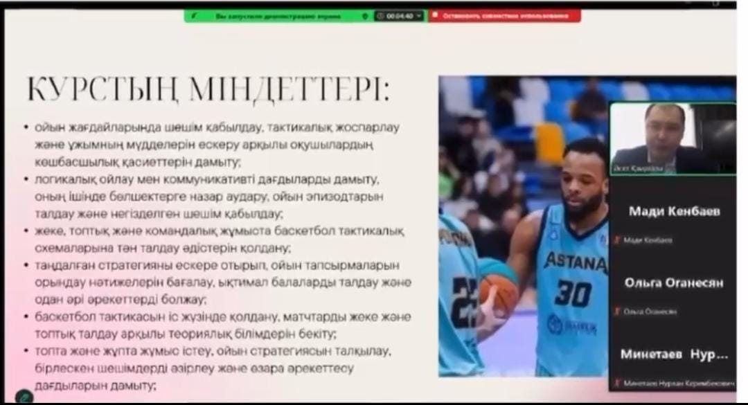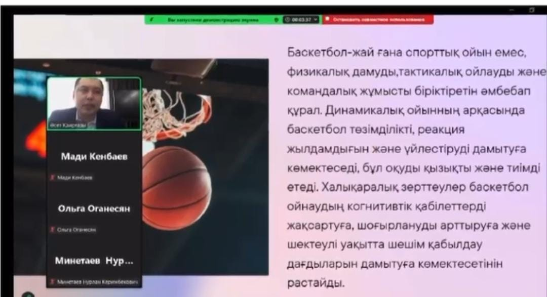 13.03.2025 жылы дене шынықтыру мұғалімі Қаирғазы Ә.С. Қазіргі заманғы баскетбол: тактикалық үлгілер мен ойын стратегиялары тақырыбында авторлық бағдарлама бойынша тәжірибені тарату мақсатында қалалық вебинар өткізді.