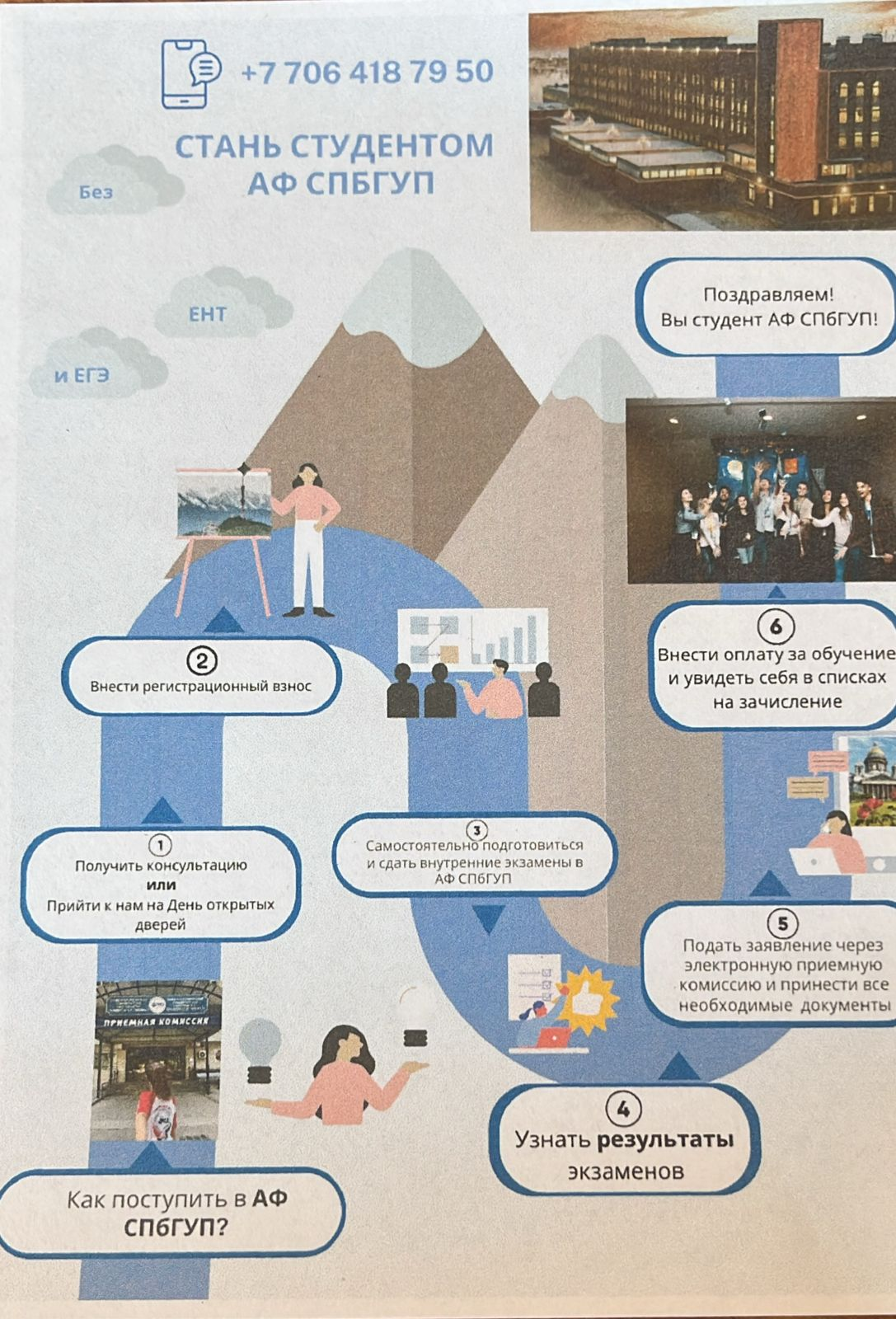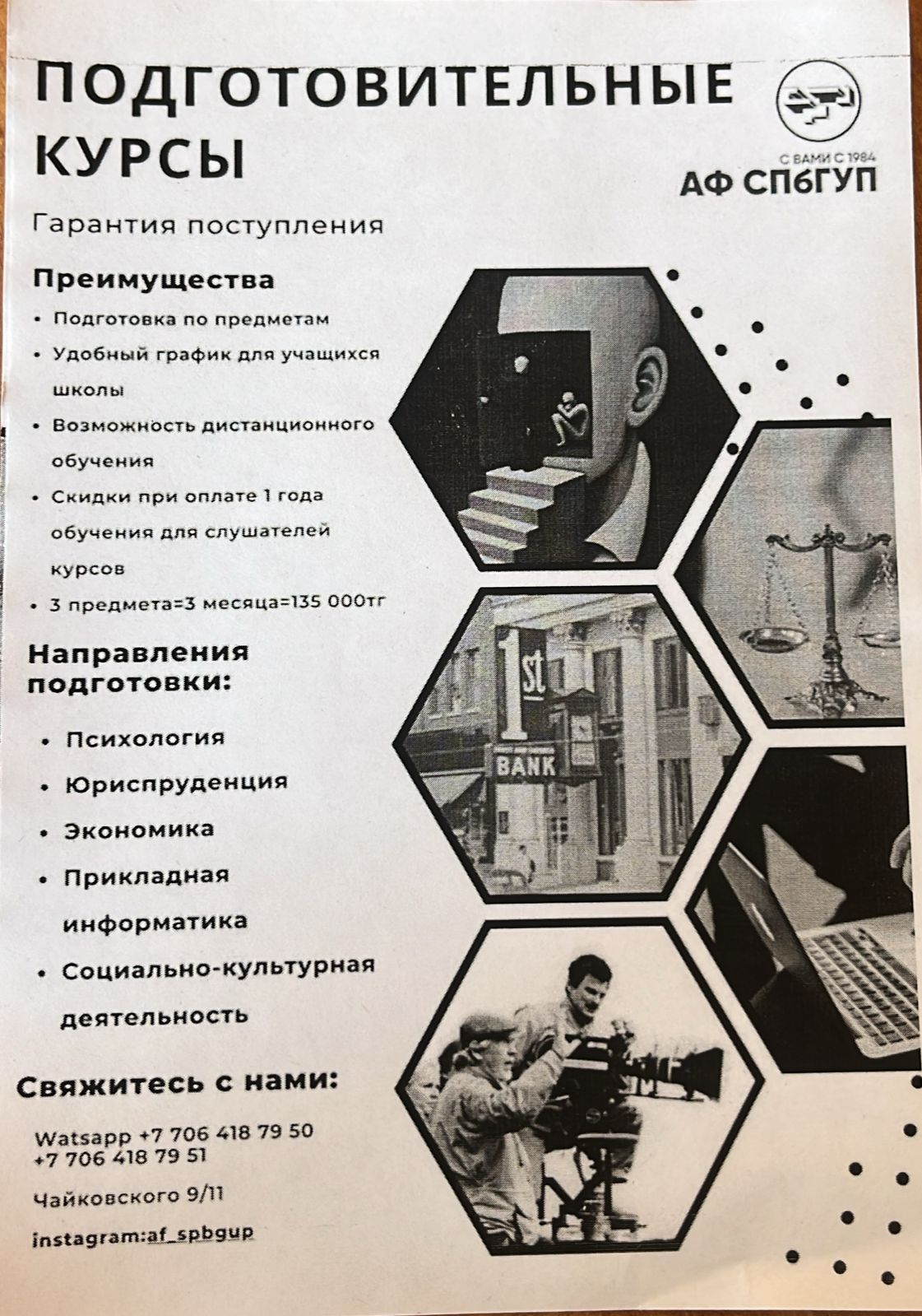 19 наурыз 2025 жылы Санкт-Петербург гуманитарлық университетінің өкілдері 11 сынып оқушыларымен кәсіби бағыт бағдар беру жұмыстарын жүргізді. Университетке түсудің екі жолы бар: жазда емтихандарды өз бетінше тапсыру немесе түсудің кепілі болып табылатын дайындық курстарының көмегімен. Оқушылар қосымша сұрақ қойып, сұрақтарына жауап алды.