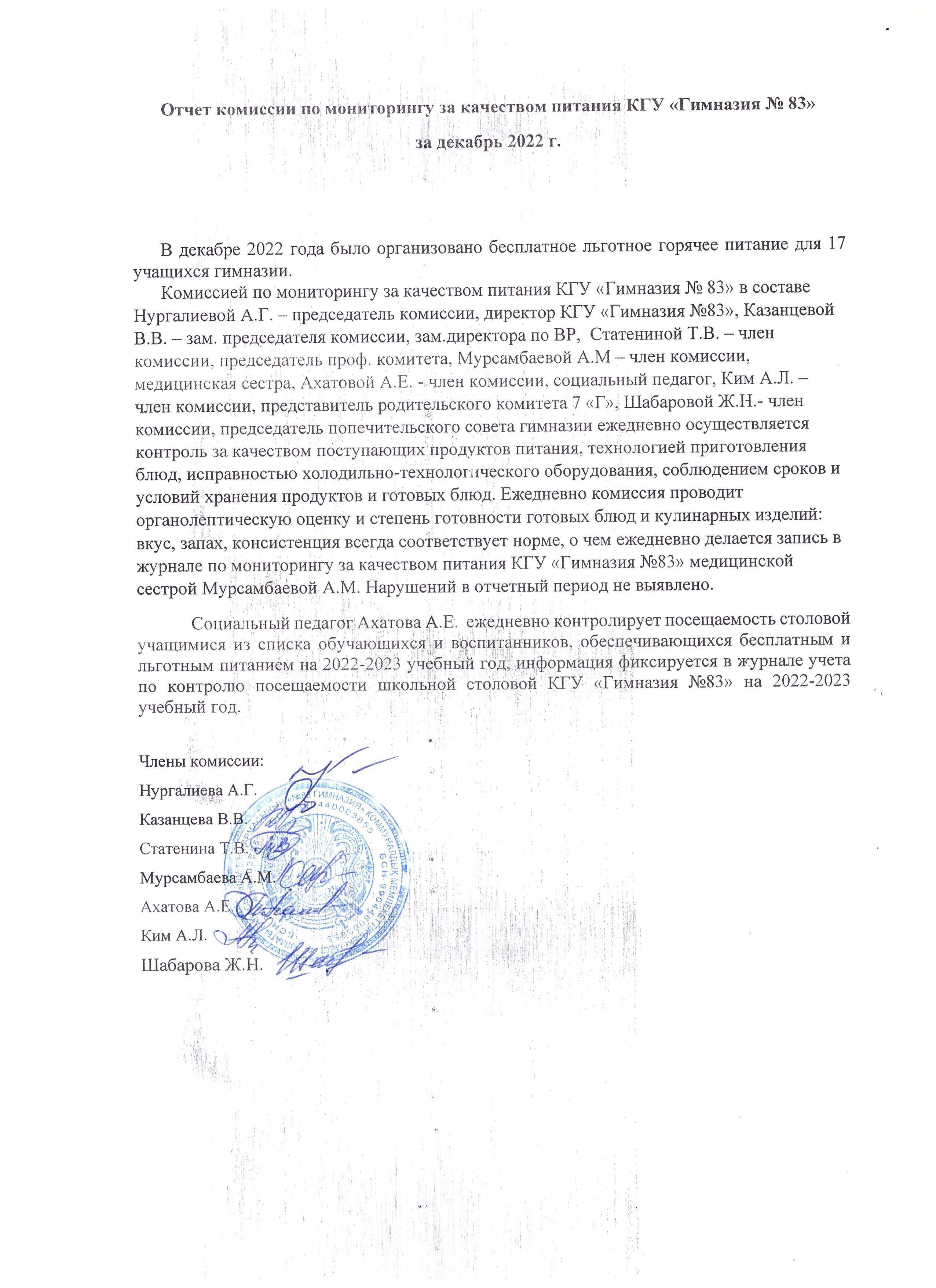04 қаңтар 2023 «№ 83 гимназия» КММ 2022 ж желтоқсан айындағы тағам сапасының мониторингі бойынша комиссия есебі / Отчет комиссии по мониторингу за качеством питания