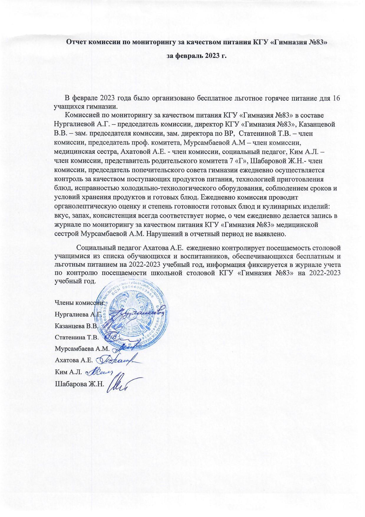 01 наурыз 2023 Бақылау комиссиясының 2023 жылғы ақпан айындағы есебі / Отчет комиссии по мониторингу за качеством питания за февраль 2023 года.