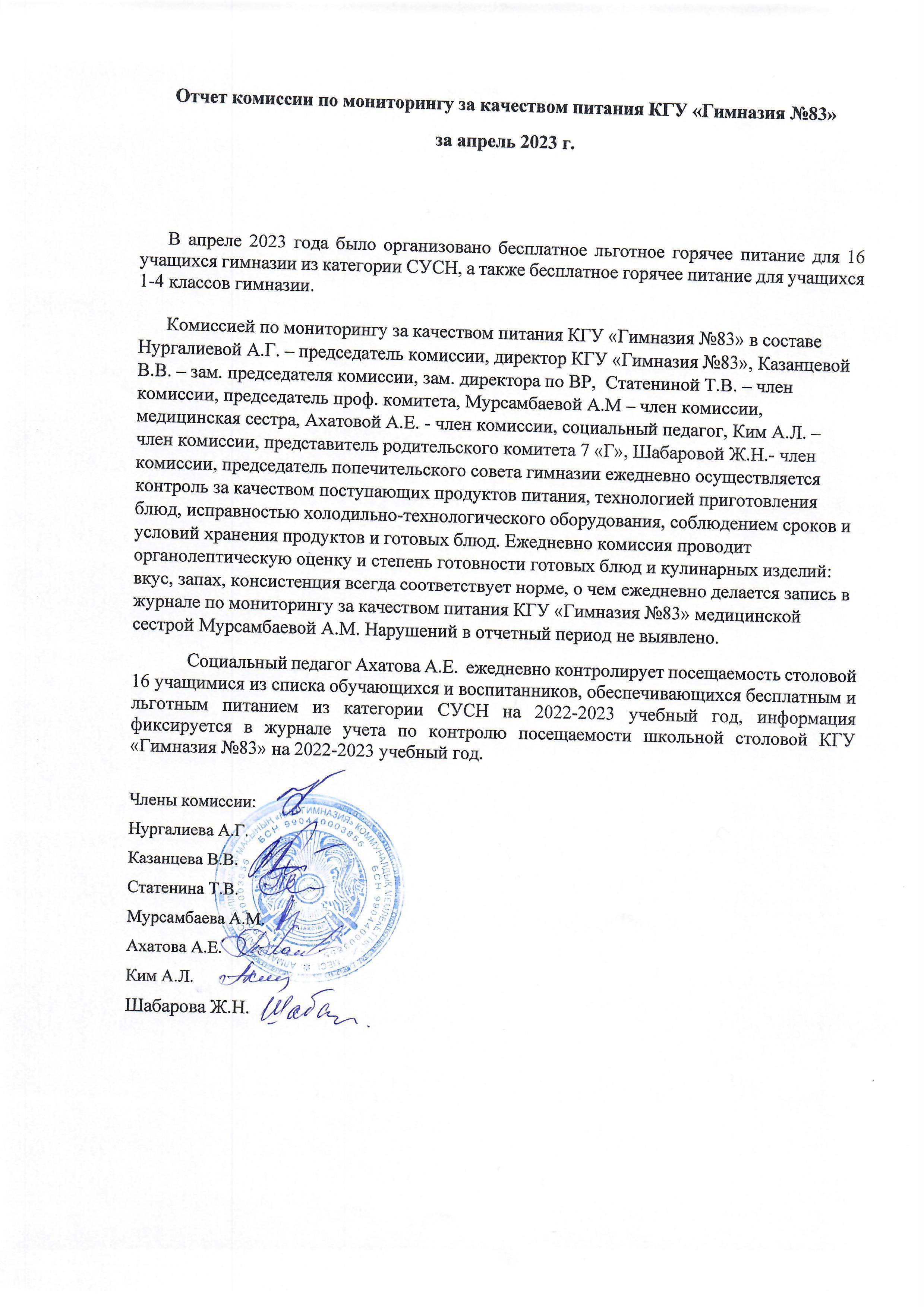 02 мамыр 2023 Бақылау комиссиясының 2023 жылғы сәүір айындағы есебі / Отчет комиссии по мониторингу за качеством питания за апрель 2023 года.