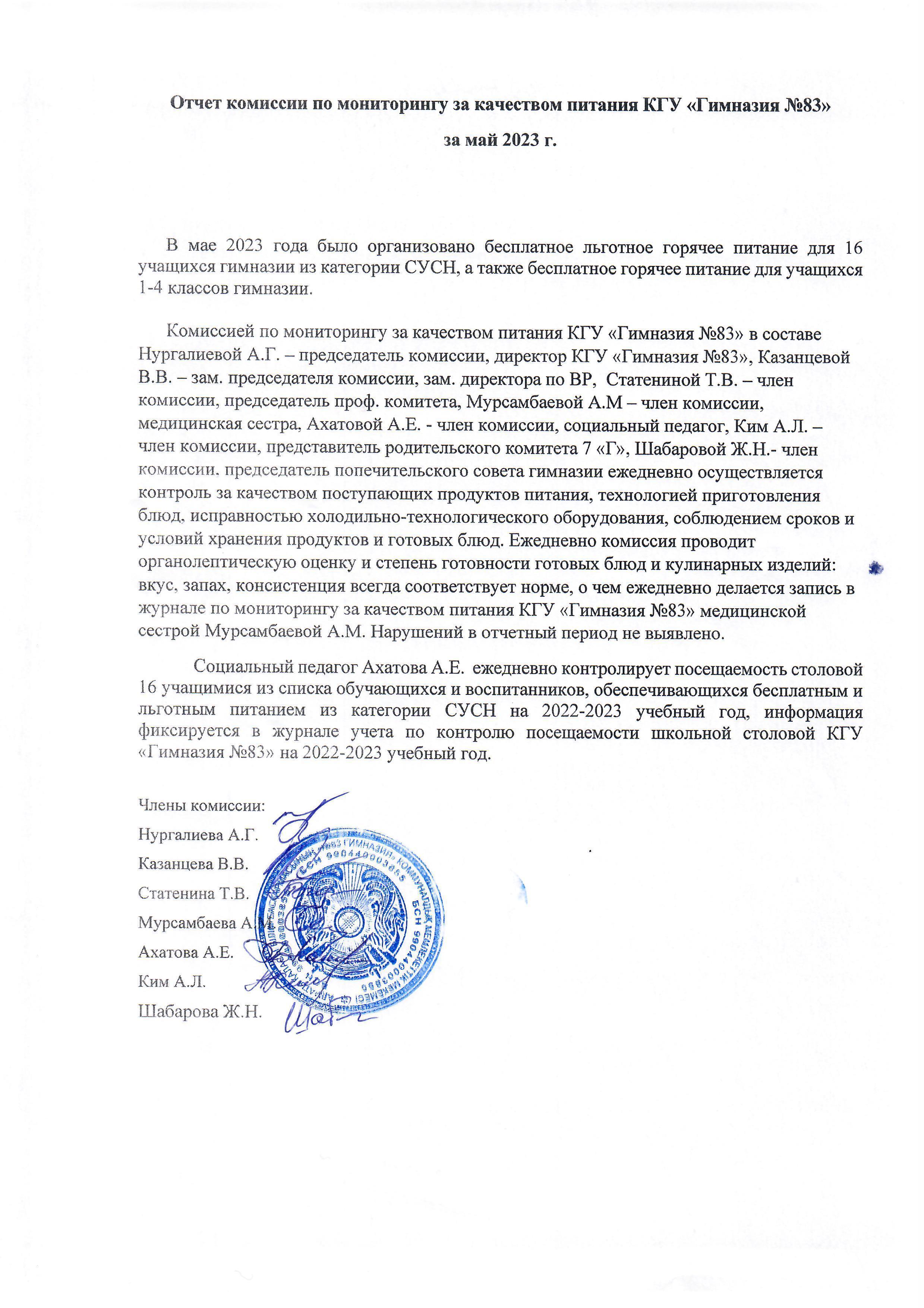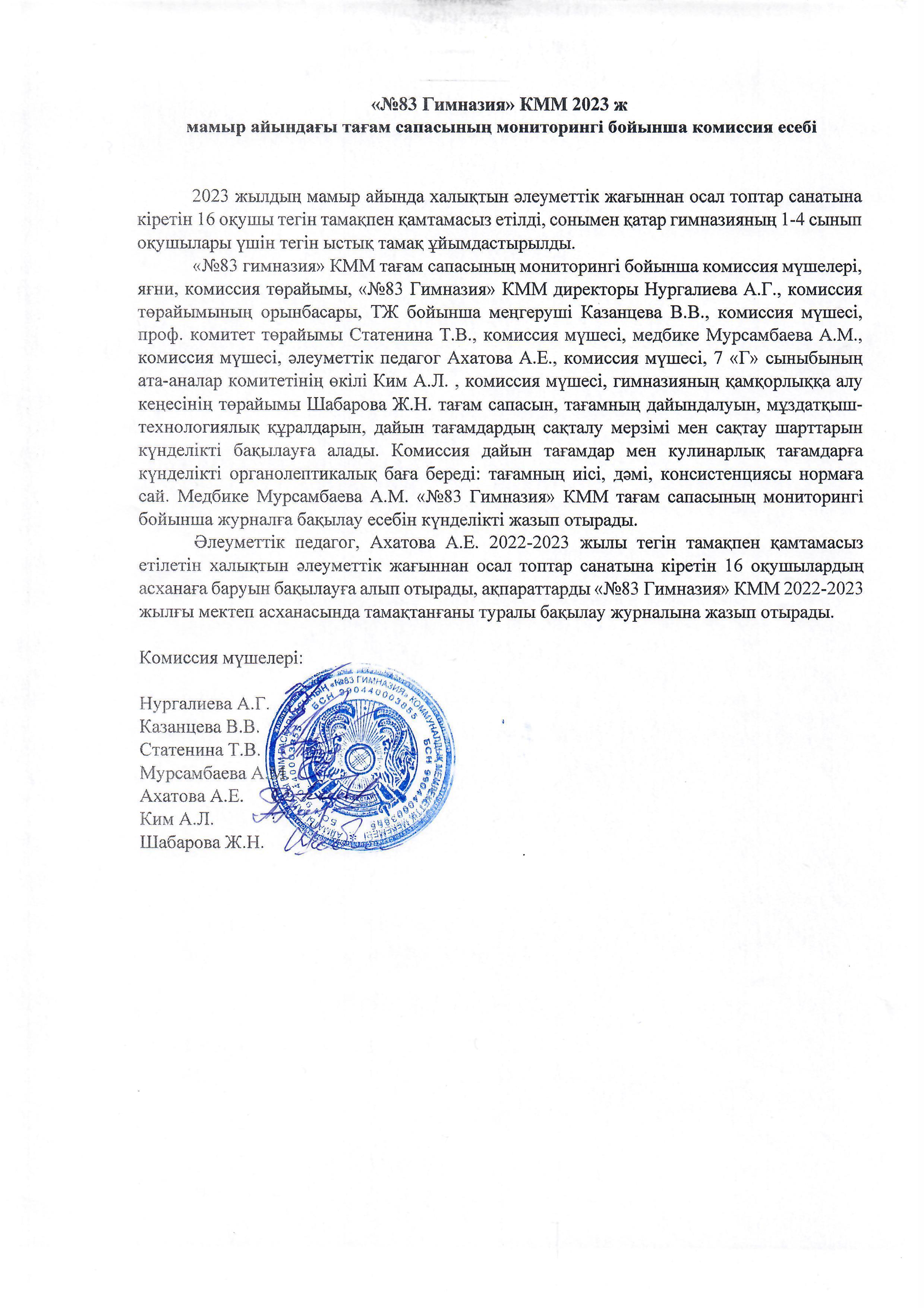 01 маусым 2023 Бақылау комиссиясының 2023 жылғы мамыр айындағы есебі / Отчет комиссии по мониторингу за качеством питания за май 2023 года.