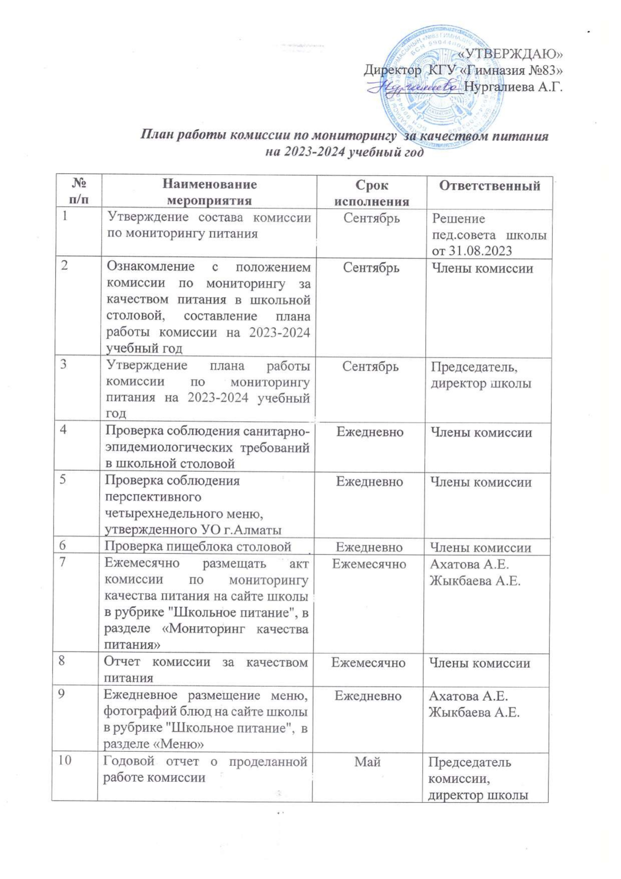 Тамақтану сапасын бақылау комиссиясының 2022-2023 оқу жылына арналған жұмыс жоспары / План работы комиссии по мониторингу за качеством питания на 2022