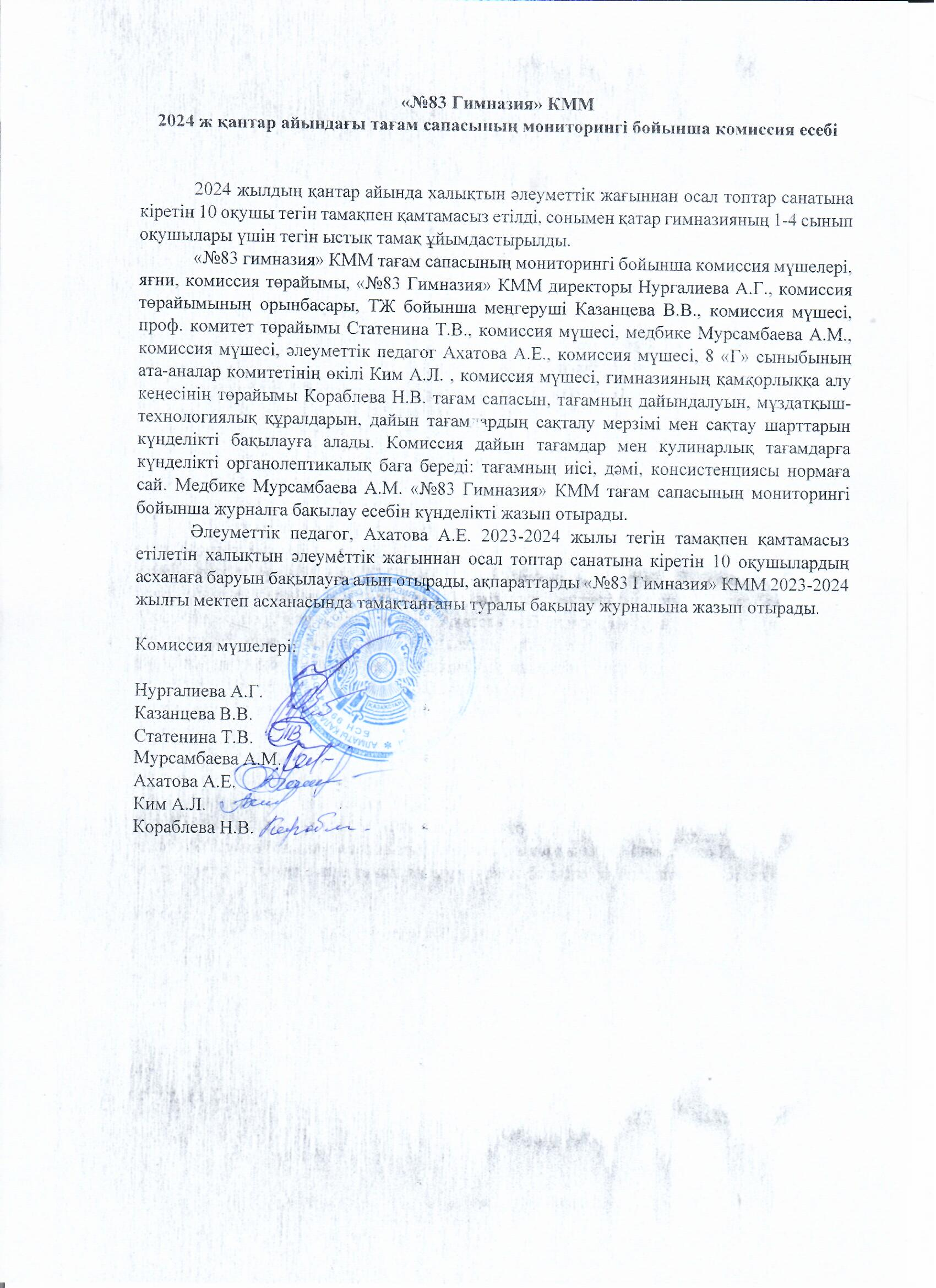 02 ақпан 2024 "№83 гимназия" КММ 2024 ж. қаңтар айындағы тағам сапасының мониторингі бойынша комиссия есебі