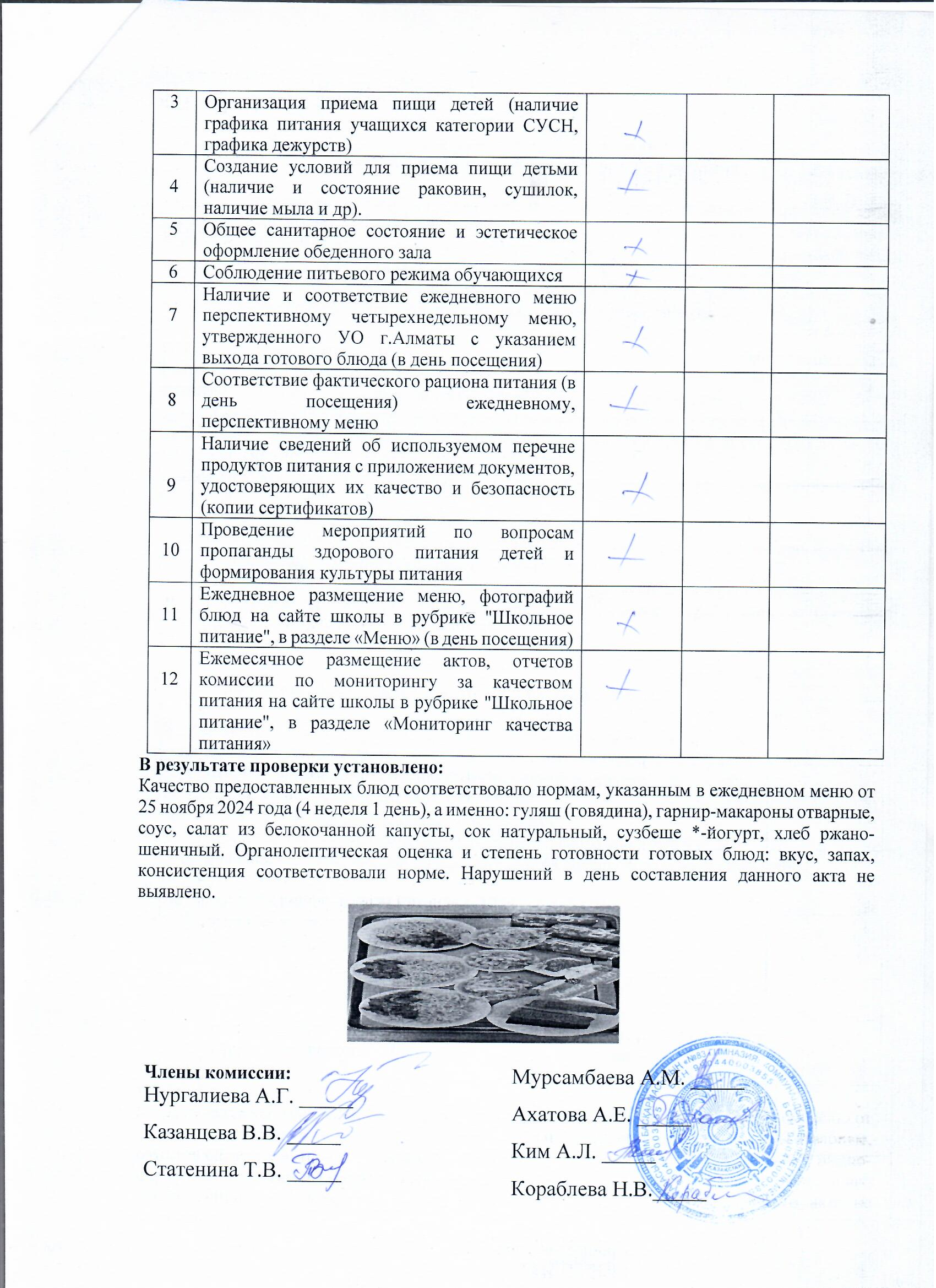 Тамақ сапасын бақылау комиссиясының мектеп асханасын тексеру актісі