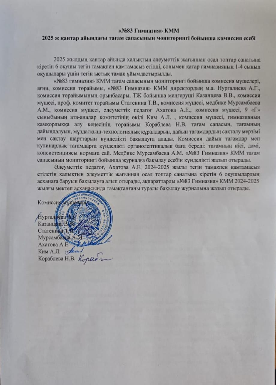 04 ақпан 2025 "83 Гимназия" КММ 2025 жылдың қаңтар айындағы тағам сапасының мониторингі бойынша комиссия есебі